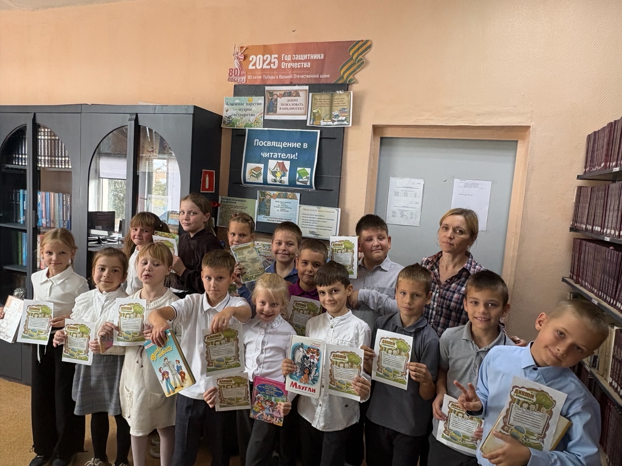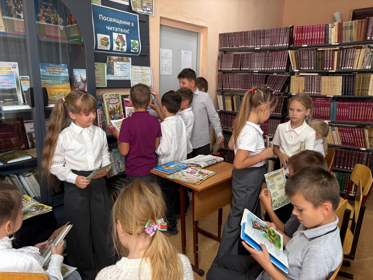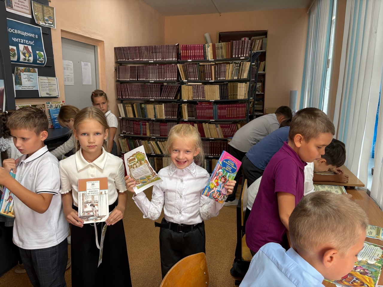19 сентября 2025 г. В школьной библиотеке состоялось ПОСВЯЩЕНИЕ В ЧИТАТЕЛИ! Знакомство с библиотекой -  очень важное событие для  юных  книголюбов . Ребята совершили увлекательное путешествие по книжной стране: отгадали загадки, "узнали последние новости" из газет и журналов , посмотрели, где живут книги, выяснили, как записаться в библиотеку и как выбрать книгу на стеллаже.  Познакомились с правилами библиотеки, правилами обращения с книгой.