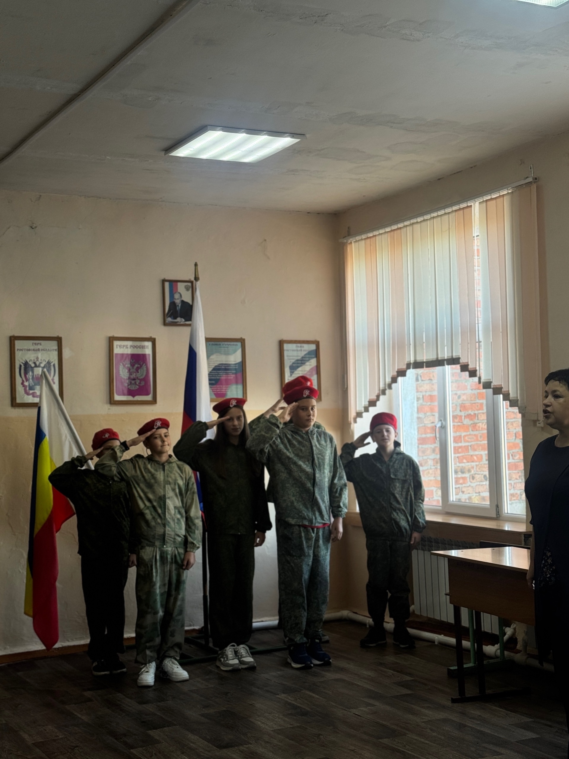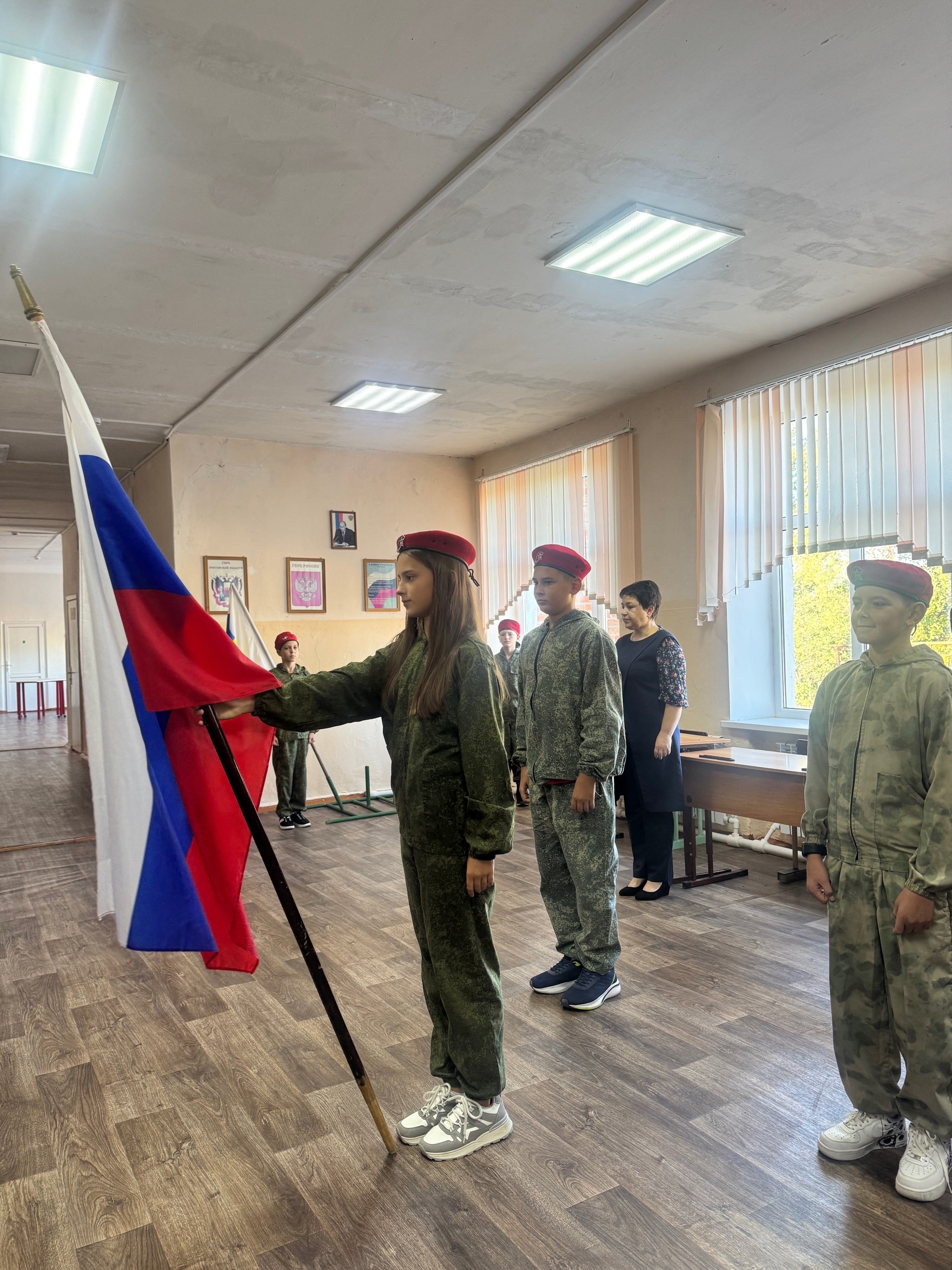 Юнармейцы под барабанную дробь на линейке торжественно выносят флаг нашей страны и устанавливают его на почетное место, звучит гимн Российской Федерации.