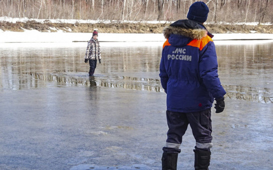При переходе по льду необходимо следовать друг за другом на расстоянии 5-6 метров друг от друга и быть готовым оказать немедленную помощь идущему впереди.
